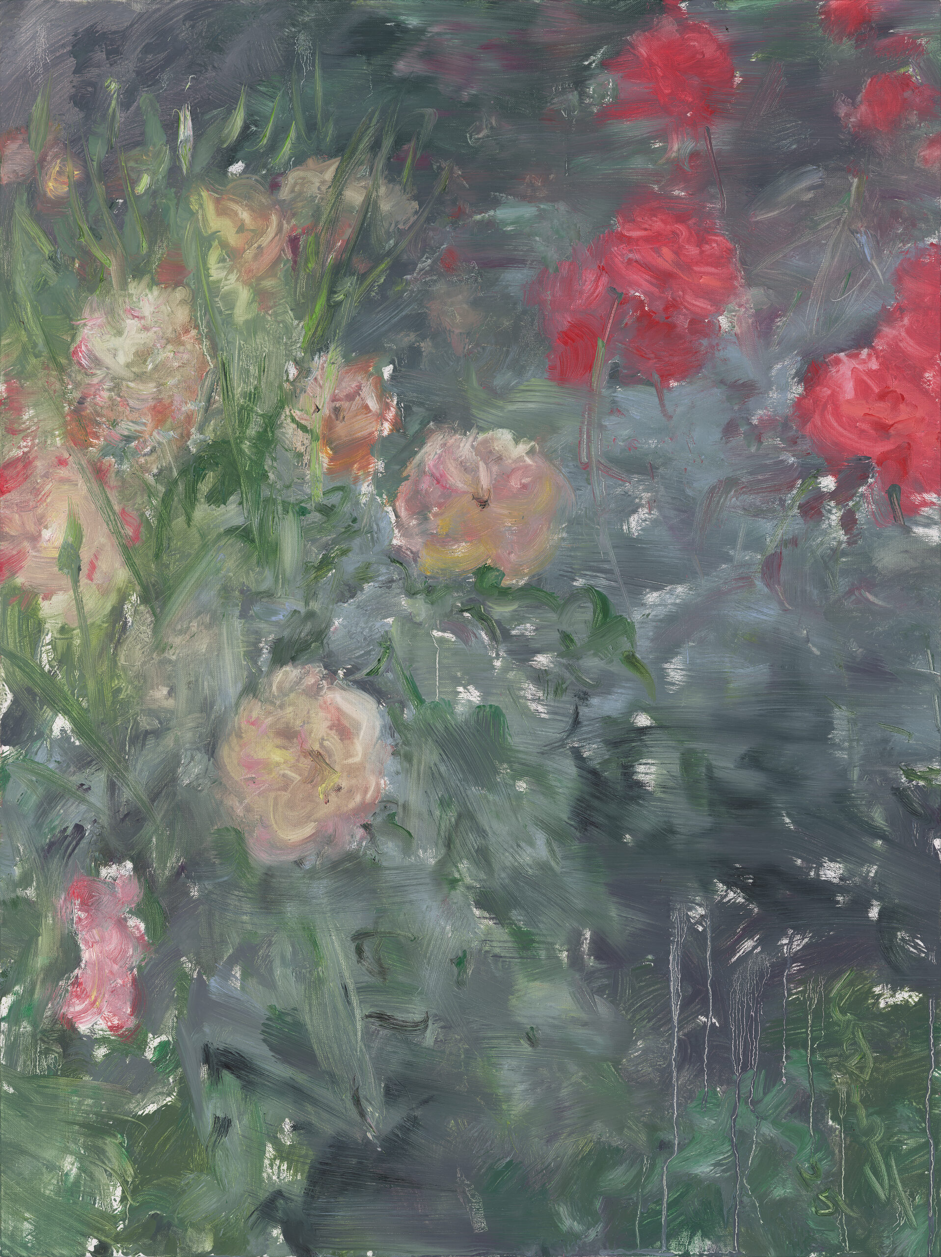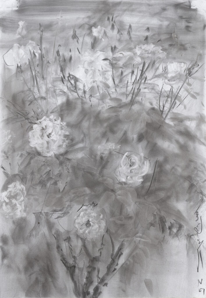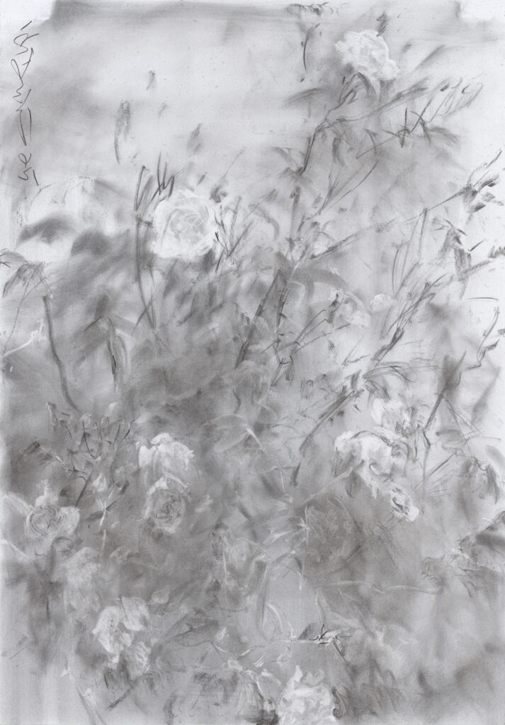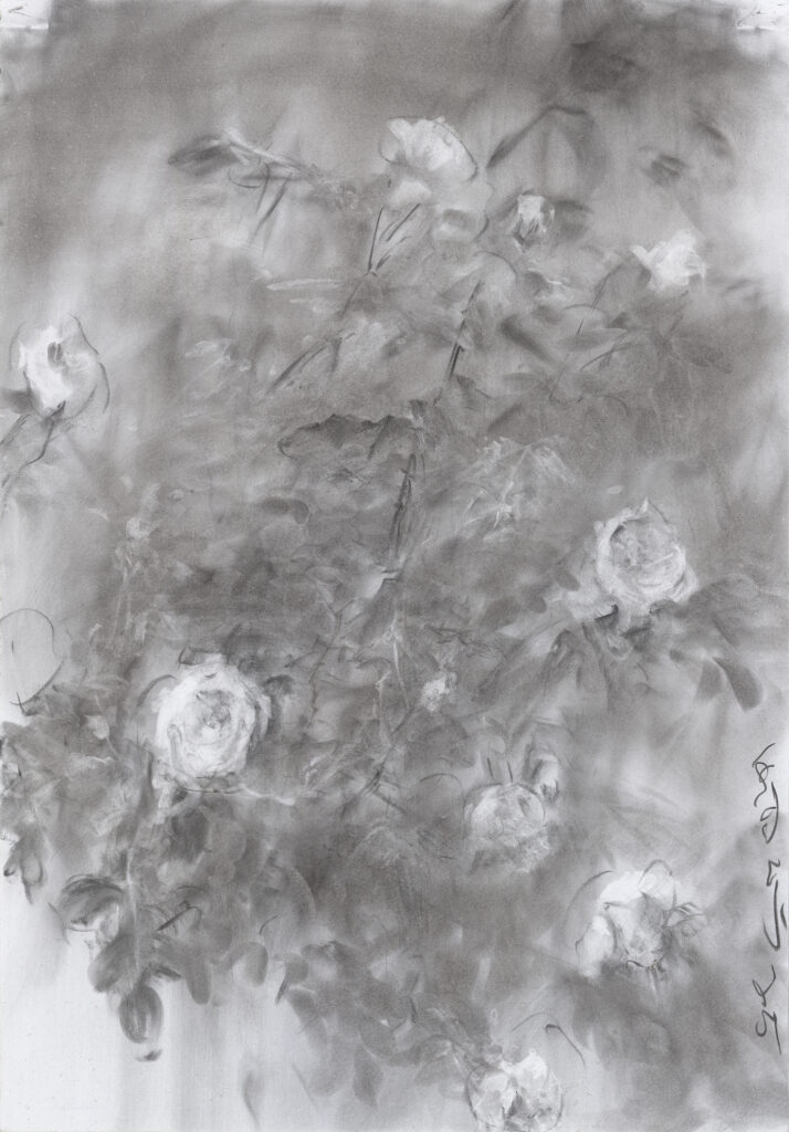 最近,为撰写本文,我又反复观看了何多苓的油画或素描杂花写生作品,我的深刻体会是:这些作品从多个侧面揭示了艺术家的创作密码,比如,有某些作品显示出他将中国传统水墨画的“散点透视”改造为时空叠印的构图方式;还有某些作品不仅追求心手合一的做法,还力图显示出作画的全部过程;另有某些作品则显示出他对用笔意味或“留白”的匠心处理等等。我在现场看他作画时不由得感到:他所进行的艺术探索,已经生动体现了“再中国化”的绘画新路径——其显然不是简单重复传统,而是结合新的审美需要进行了创造性转换,相信有机会观看艺术家以油画或炭粉写生杂花过程的人,一定会颠覆已往对所谓“油画写生”与“素描写生”的认知。而这也正是我将相关作品称为“写意油画”与“写意素描”的原因。